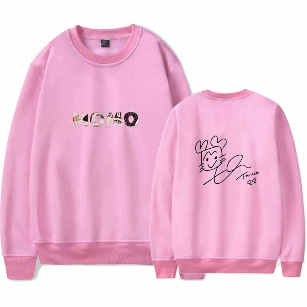 Momo K-pop merchandise sweatshirt, black crewneck with floral Momo design and signature back print. MOHO sweatshirt with colorful logo and cute drawing, perfect for K-pop fans.