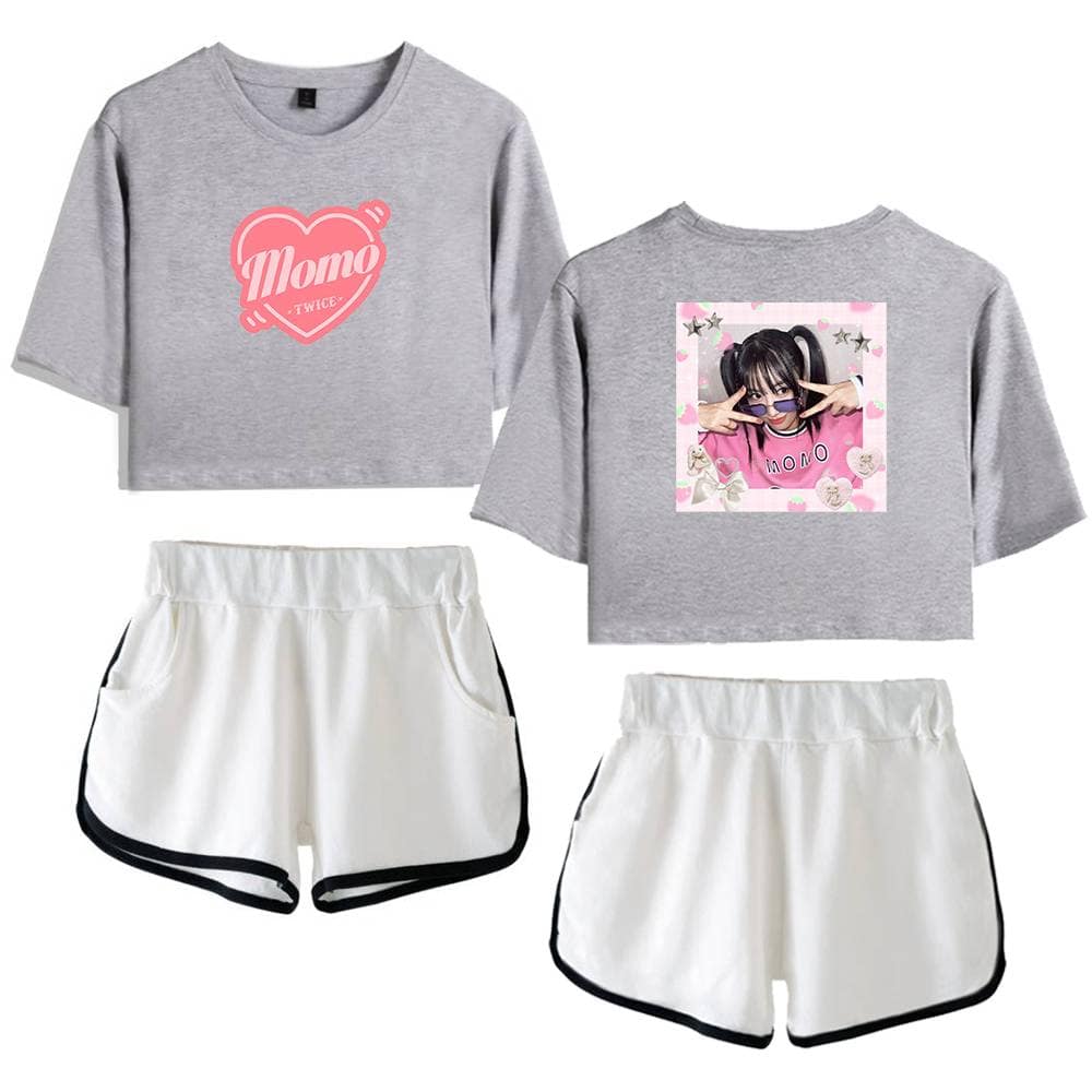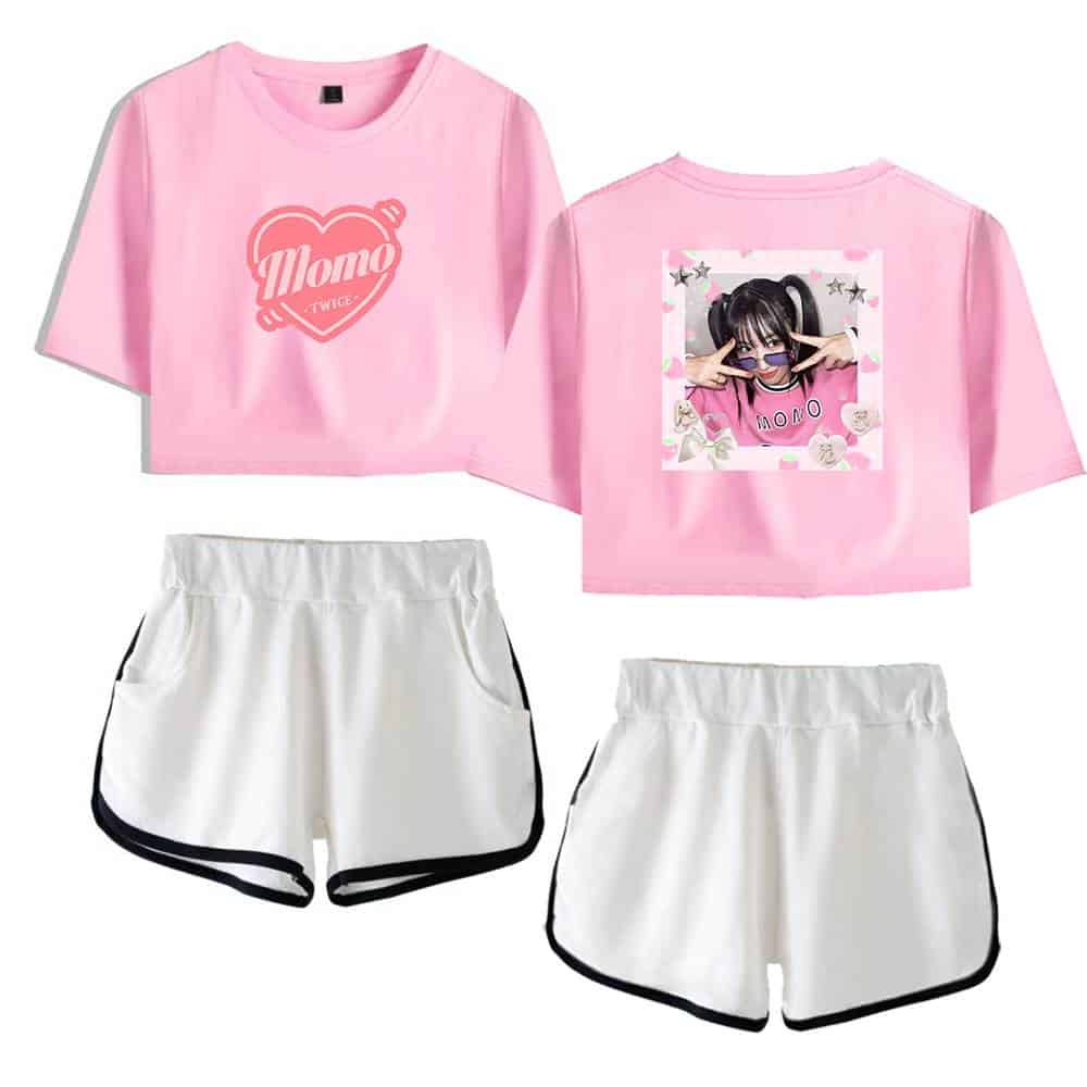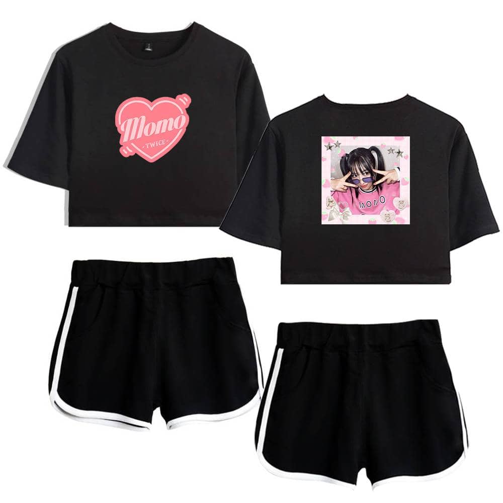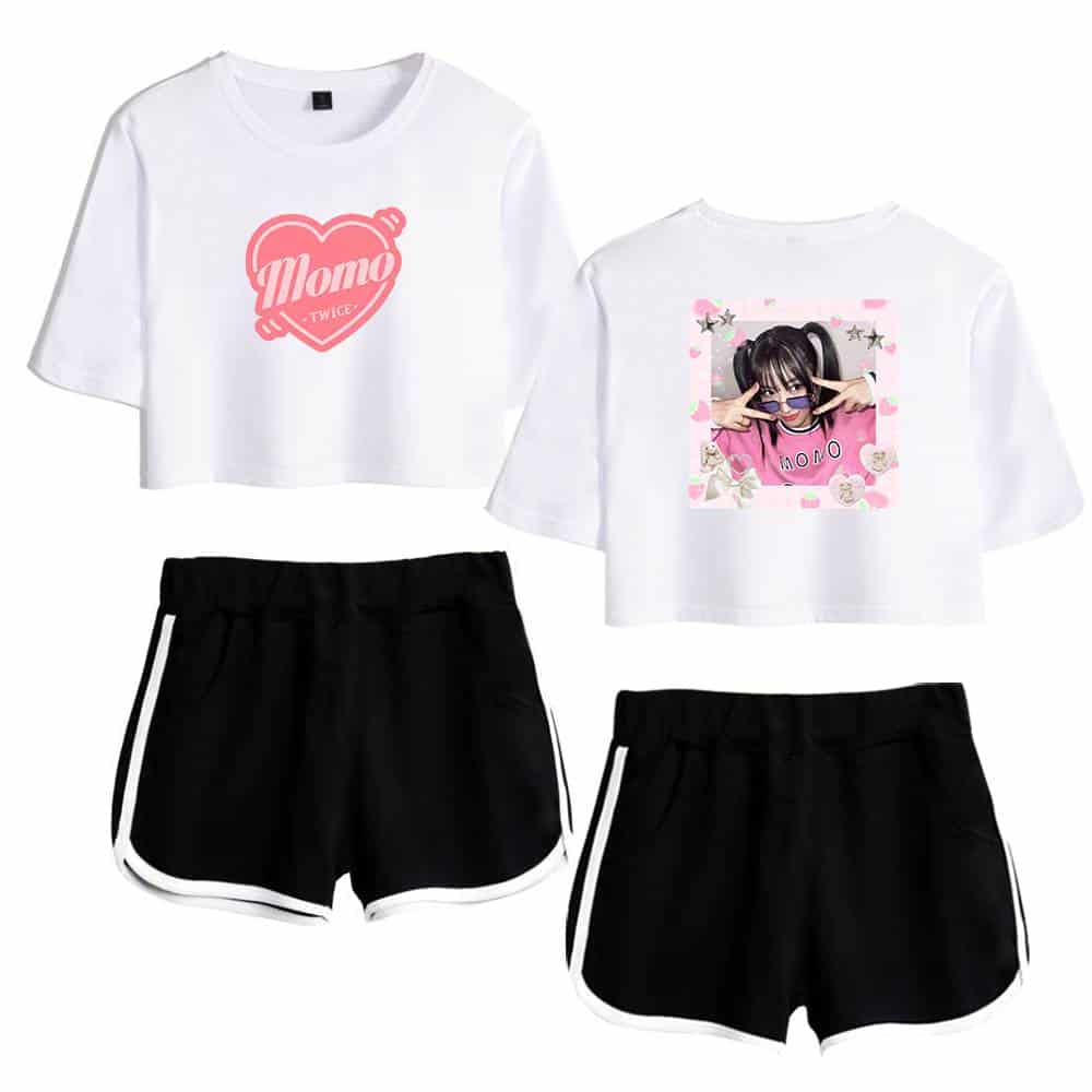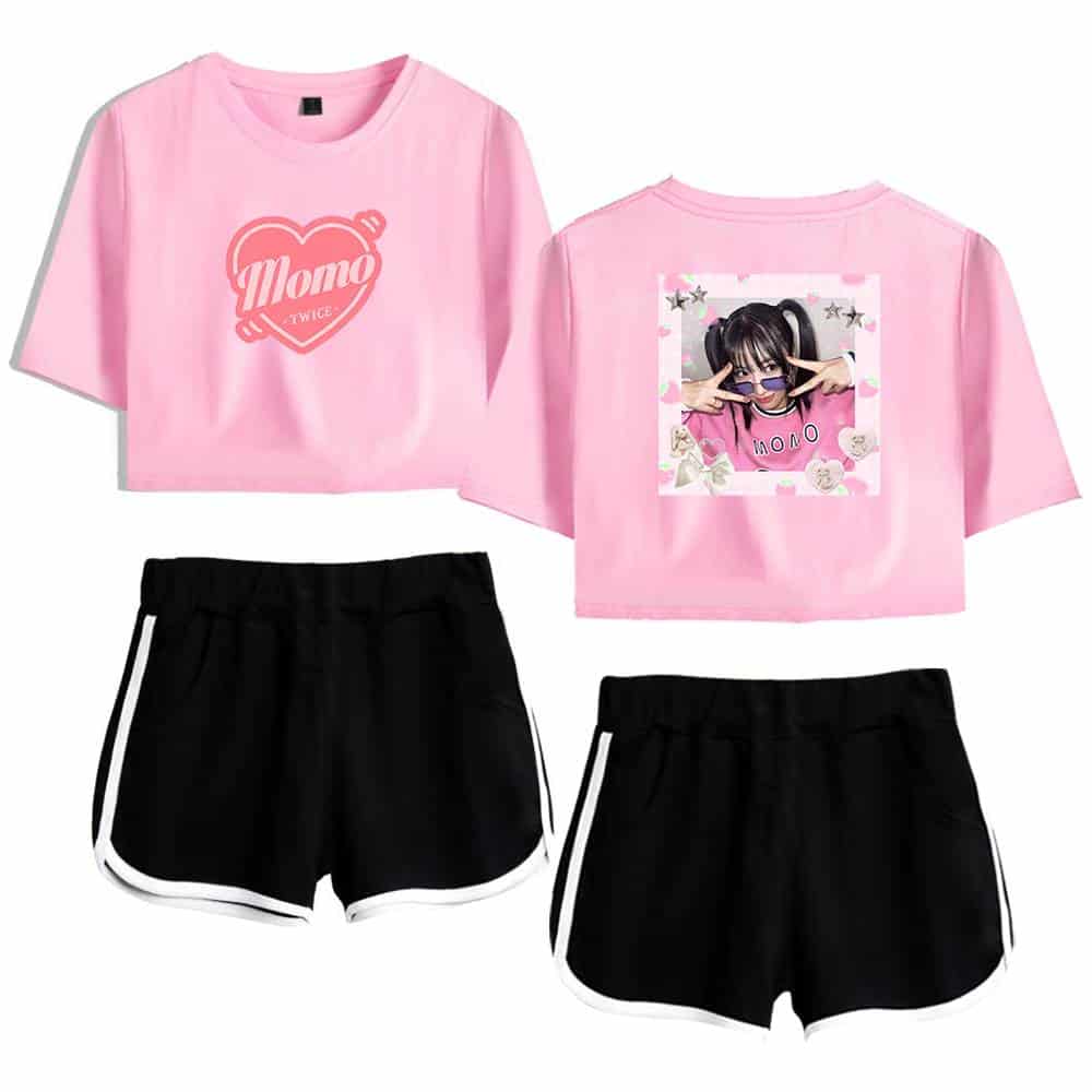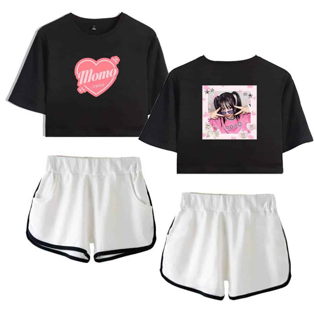 Twice kpop merch set featuring black crop tops with pink graphic designs and matching black shorts with white trim targetting fans of TWICE Momo. Momo twice kpop merchandise, casual crop top and shorts, black and white athletic wear, K-pop fan apparel, trendy twin K-pop merch for fans. White t-shirt with pink "Momo" graphic and girl with pigtails print, black athletic shorts with white stripes, casual K-pop merchandise set for fans, trendy and comfortable K-pop themed clothing, perfect for teen fans and concert wear. Momo twice pink t-shirt with graphic and shorts, kpop merchandise. Pink K-pop merchandise set featuring a pink graphic crop top with "Momo TWICE" design and a matching photo print crop top, paired with white athletic shorts with black trim. Twice kpop merch, twice kpop merchandise, stylish twice-inspired apparel for fans.