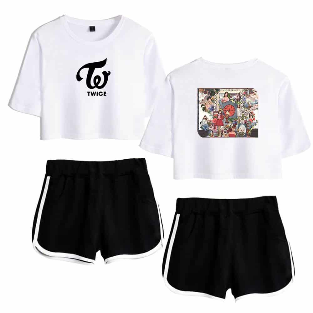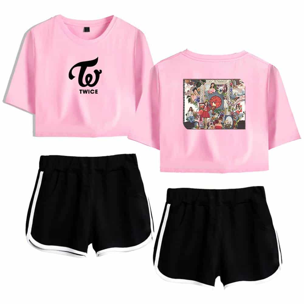 TWICE kpop merchandise set with black cropped T-shirts featuring TWICE logo and colorful album artwork, paired with black athletic shorts with white trim. Perfect for fans and casual wear. TWICE K-pop merchandise set featuring black crop tops with TWICE logo and colorful graphic back prints, paired with white sporty shorts with black trim. Perfect for fans!. TWICE Kpop merch set featuring white cropped T-shirts with TWICE logo and colorful graphic back print, paired with black athletic shorts with white stripe accents for fans. TWICE K-pop merchandise set with pink crop top featuring TWICE logo, illustrated back design, and matching black shorts with white trim. Perfect for fans and casual wear. Twice kpop merch, pink TWICE crop top featuring the group's logo and colorful back print, paired with white athletic shorts with black trim, perfect for K-pop fans and concert wear. Twice kpop merch, K-pop Twice graphic crop tops and shorts for fans, popular K-pop merchandise for concerts and casual wear, stylish and comfortable apparel for Twice fans.