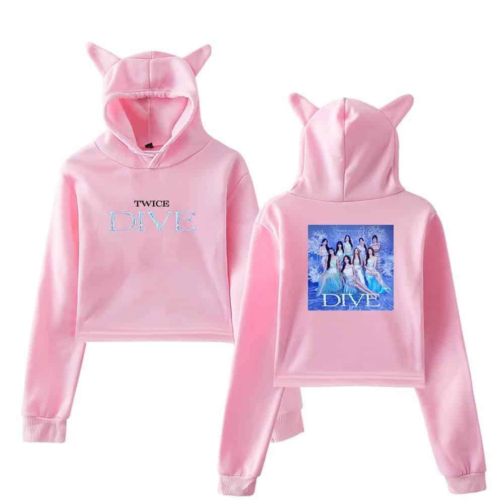 TWICE DIVE hoodie with cat ears, featuring a front logo and back photo of the group, perfect for K-pop fans and merchandise collectors. Owl plushie bunny hoodie with bunny ears, perfect for K-pop merchandise fans of all ages.