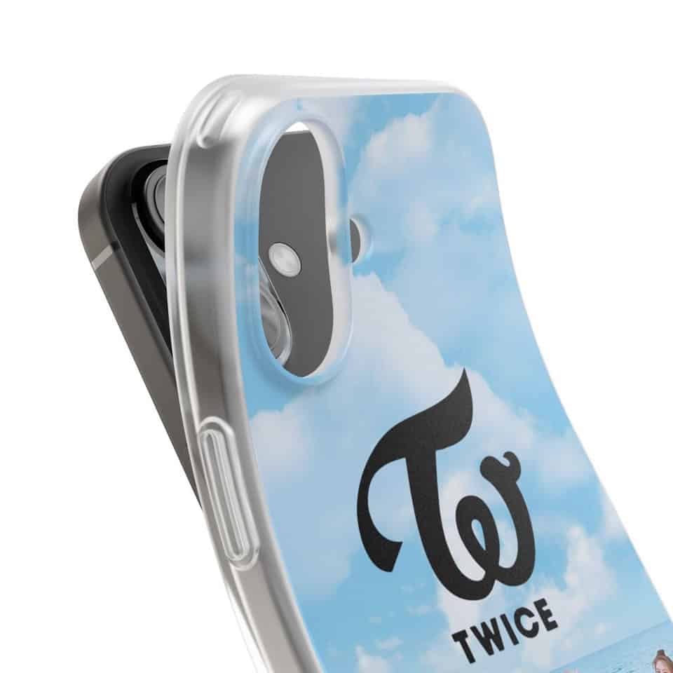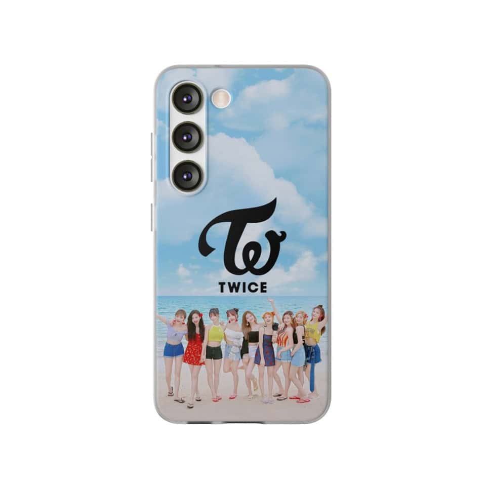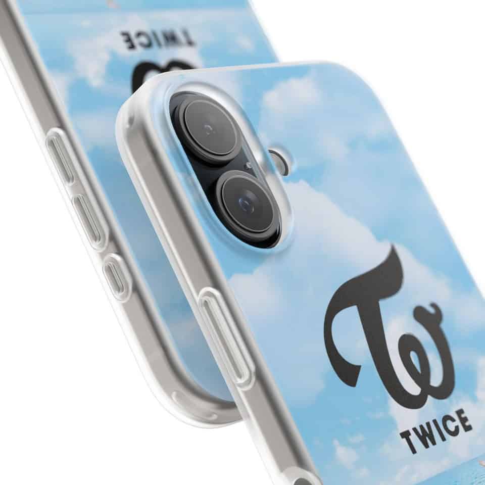 Twice kpop merch phone case featuring the popular girl group TWICE at the beach with bright colors and the group's logo. Perfect for fans who love celebrating their favorite K-pop idols. Filename: twice-kpop-merch-phone-case-sky-illustration.jpg. Twice kpop merch, twice kpop merchandise, TWICE logo phone case with sky and clouds design, popular K-pop group TWICE themed phone case featuring their logo and a sky background, ideal for fans wanting stylish K-pop merchandise.