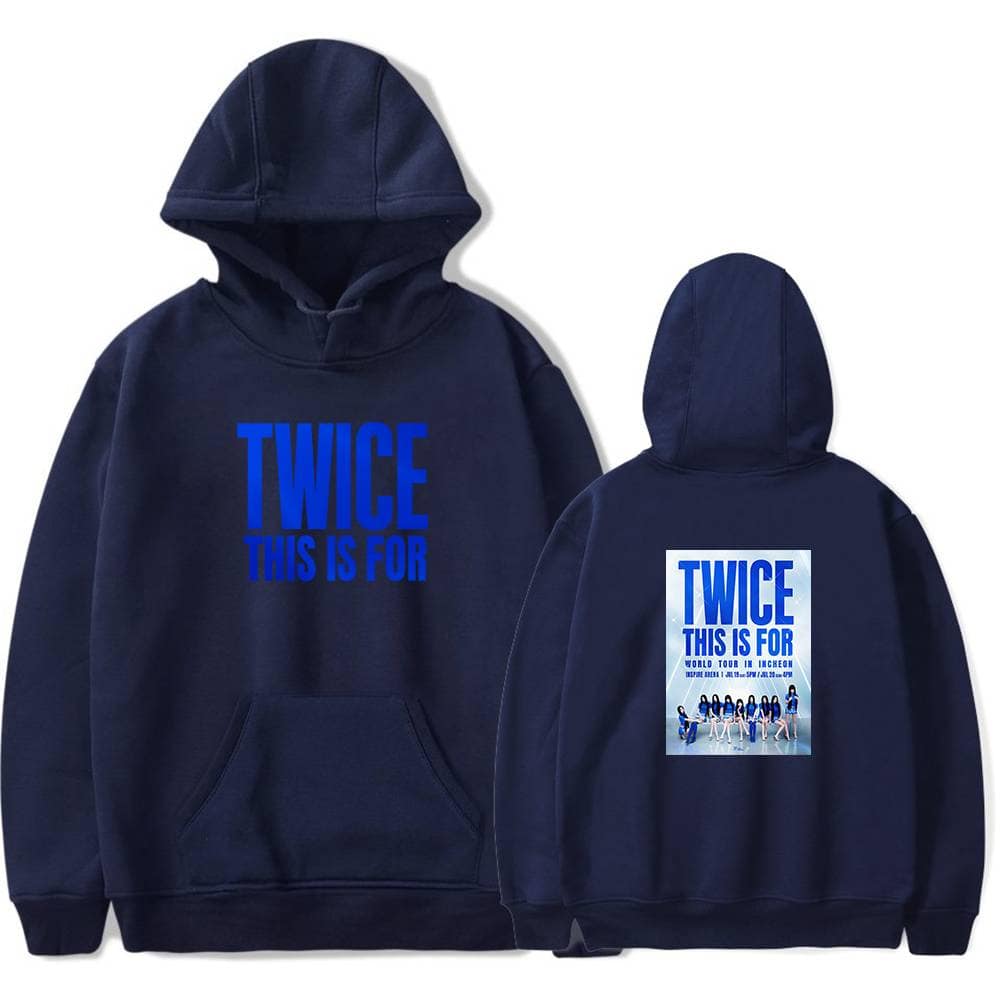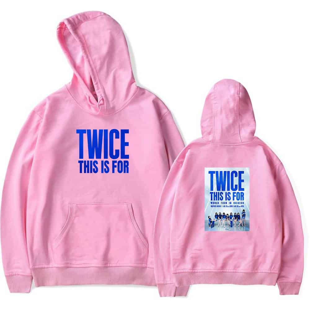TWICE hoodie with concert print, black oversized sweatshirt featuring bold blue text and group photo, perfect for Kpop merch fans. TWICE hoodie sweatshirt with printed tour poster, popular K-pop merchandise for fans, featuring bold logo and group photo. Perfect for showcasing fandom and casual style. TWICE hoodie with bold blue text on the front and a graphic design on the back, perfect for K-pop fans. TWICE hoodie with concert tour print, casual K-pop merchandise for fans. Twice pink hoodie with tour graphic for Kpop fans.