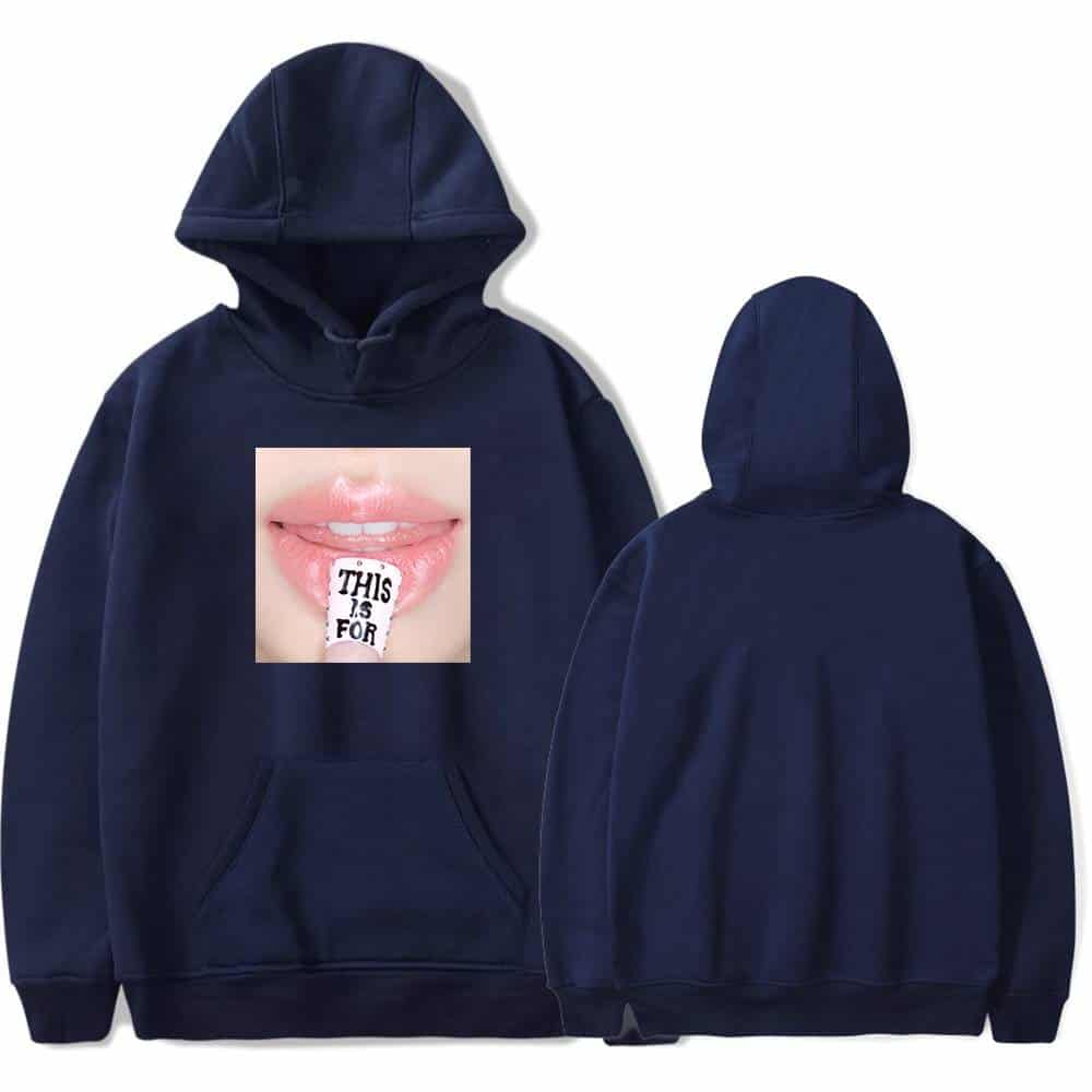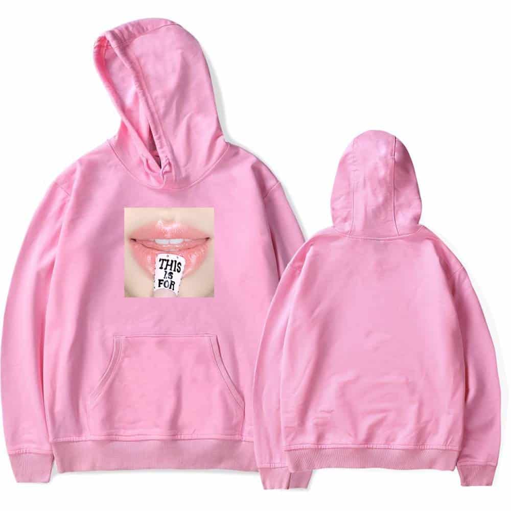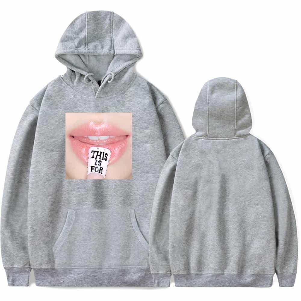 Black hoodie with a graphic of lips and a finger with "THIS IS FOR" text, perfect for K-pop fans who love merchandise and stylish apparel. Great for expressing fandom culture and style in daily wear. White hoodie featuring a close-up graphic of lips with a lip balm saying "THIS IS FOR". Perfect for K-pop fans who love trendy merch and unique designs. Made of soft, comfortable material for everyday wear. Plushie-kpop-merch-blackpink-hoodie.jpg. Grey hoodie with graphic lip print and "This is for" text on tongue, unisex style, comfortable casual streetwear, perfect for Kpop fans, stylish and trendy merch, soft fabric, oversized fit. Pink hoodie with graphic print of lips and "This is for" text on tongue, oversized and trendy, perfect for K-pop fans, unisex fashion statement, soft fabric, casual wear, popular K-pop merchandise.