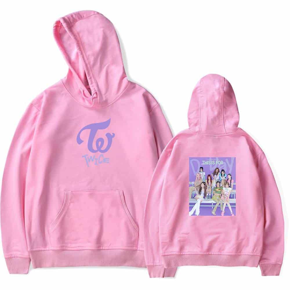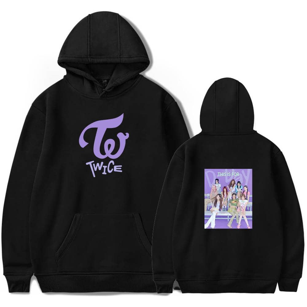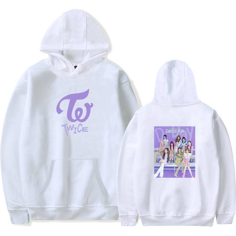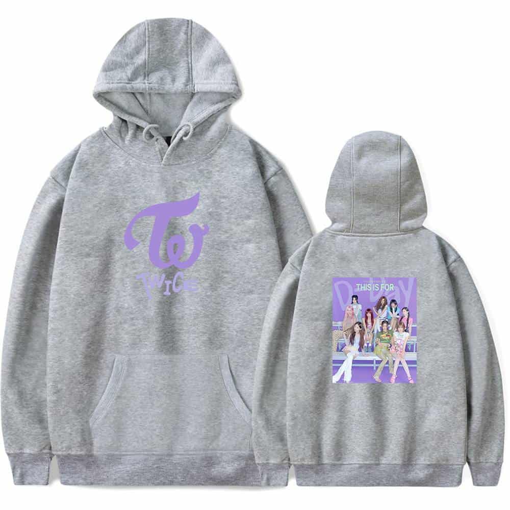 TWICE hoodie sweatshirt with purple TWICE logo on front and group photo on back, perfect Kpop merch for fans of the girl group. Twice K-pop merch hoodie in white with purple TWICE logo and group photo on the back, perfect for fans. Twice kpop merch hoodie with TWICE logo and group image on back, perfect for fans of the K-pop girl group, available in various sizes. Twice kpop merch youth hoodie with group photo and purple logo design, perfect for fans and streetwear style, made of comfortable gray fabric, includes front kangaroo pocket and cozy hood. TWICE K-pop merchandise sweatshirt with pink hoodie and group graphic print, perfect for fans to show support for the popular girl group, TWICE.