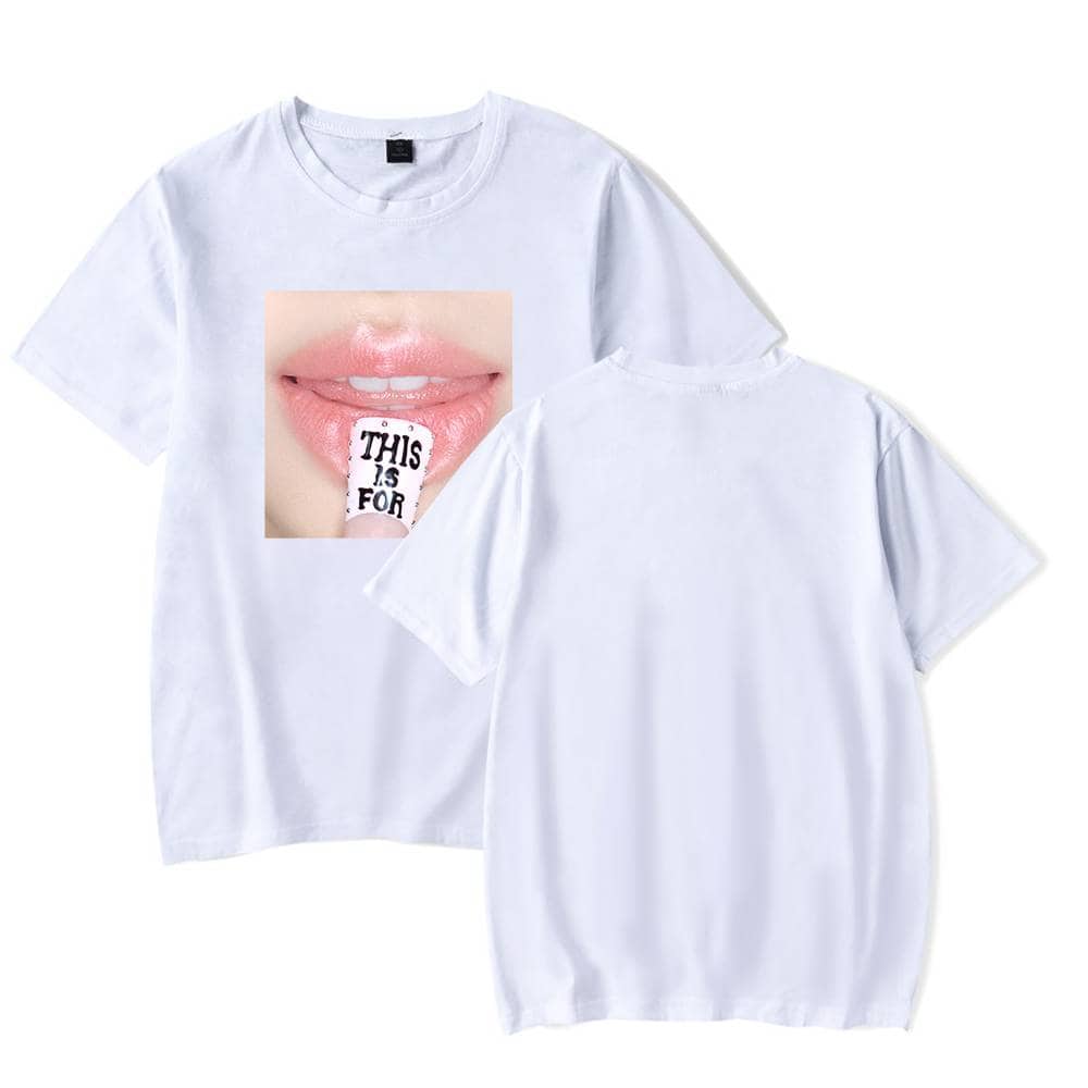 Black t-shirt with a graphic of lips and a caption card reading "THIS IS FOR", K-pop merch, trendy and stylish, perfect for fans and collectors of Korean pop music memorabilia. This is a white t-shirt featuring a close-up graphic of lips with a tongue that has text on it, related to K-pop merchandise. This is for twice kpop merch. Soft gray K-pop merch T-shirt featuring a close-up image of lips and a candy with "This is for" text design, perfect for K-pop fans and collectors of K-pop merchandise. Pink T-shirt featuring a close-up graphic of lips holding a tag that says "This is for" in black text.