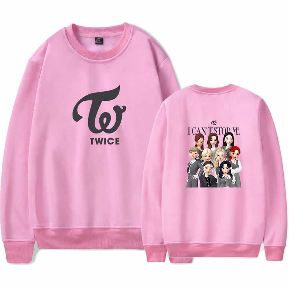 Twice Kpop merchandise sweatshirt with cartoon group design and "I CAN'T STOP ME" text. Perfect for Kpop fans wanting stylish, comfortable Twice-themed apparel. Great for concerts or casual wear. Twice kpop merch sweatshirt with group logo and animated girl group print on the back. TWICE K-pop merchandise hoodie with group graphic and slogan, perfect for fans. TWICE K-pop merchandise sweatshirt with group logo and cartoon members, perfect for fans. Twice kpop merch sweatshirt with TWICE logo and a group image with the text "To I CAN'T STOP ME" on the back.