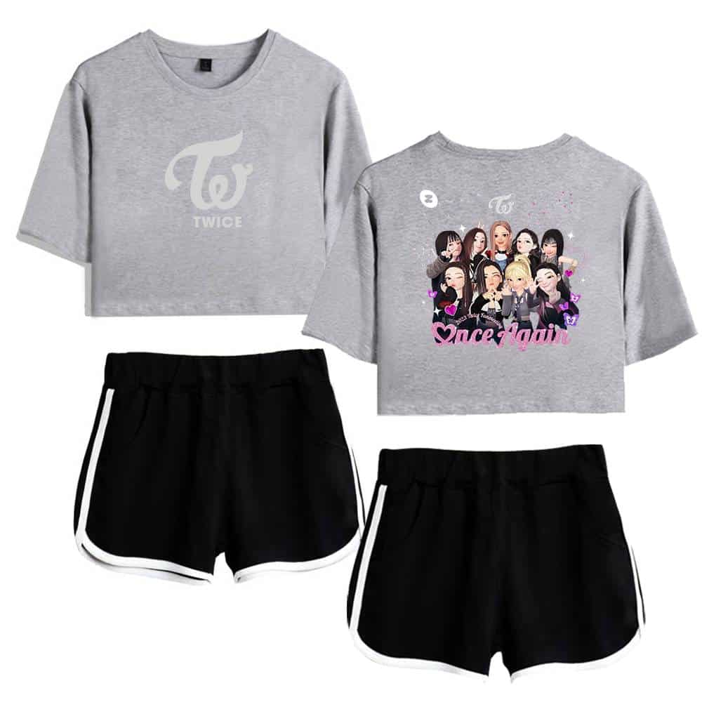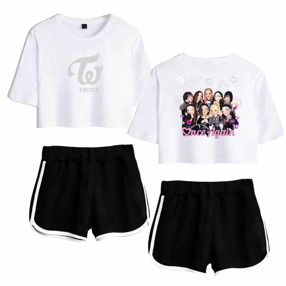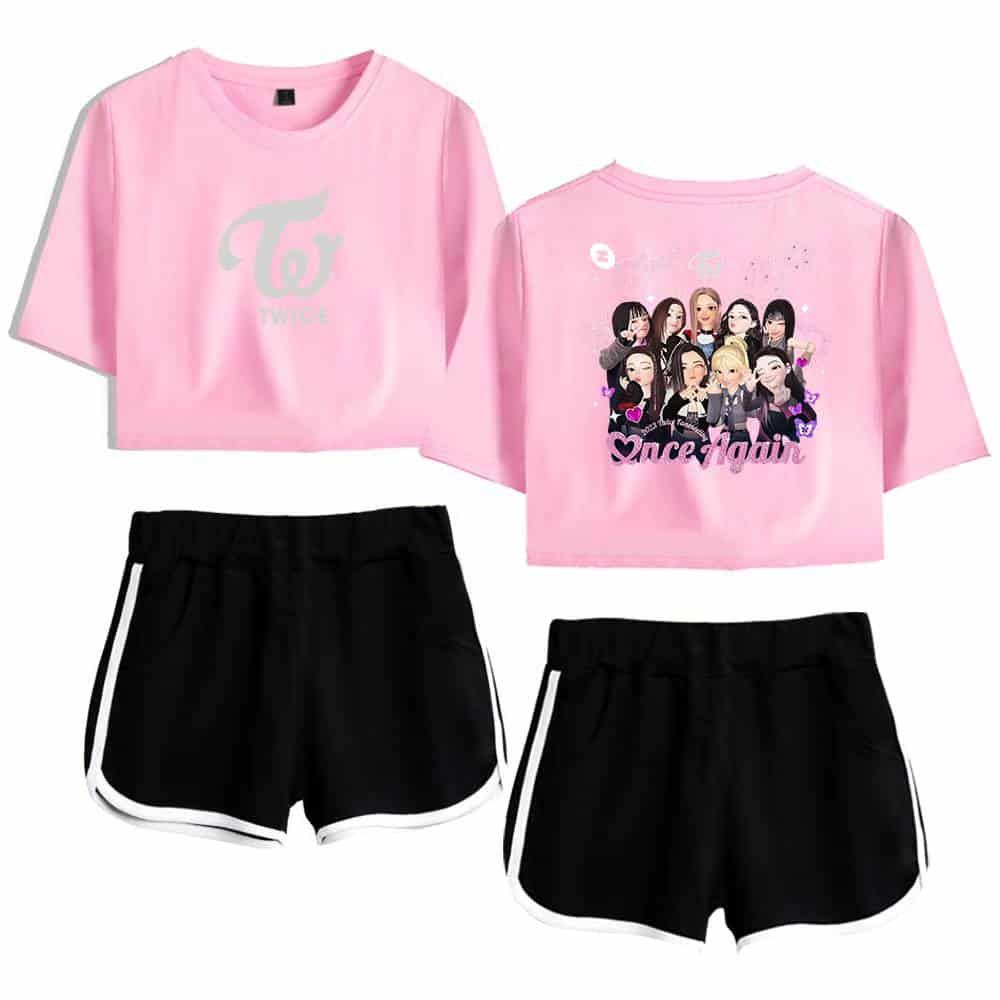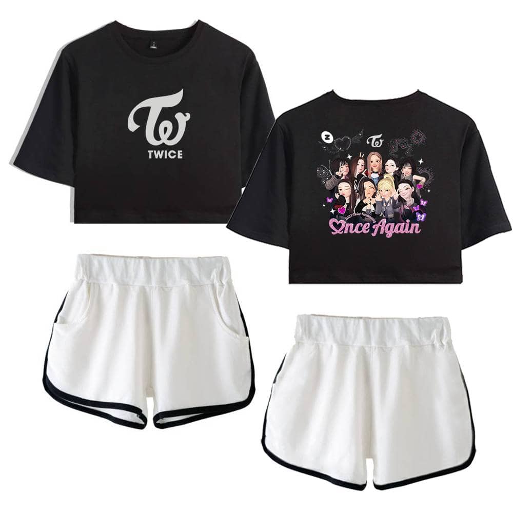 TWICE black crop top with TWICE logo, soft casual wear for K-pop fans—perfect for concerts or everyday street style. TWICE K-pop merchandise set featuring a black TWICE logo T-shirt, a group-themed graphic T-shirt, and white shorts with black trim, perfect for fans and stylish casual wear. Twice Kpop merch crop top and shorts set. Pink kpop girl group merchandise, T-shirt and shorts set, vibrant pink top with cartoon illustration of female idols, stylish black shorts with white trim, perfect for fans of K-pop groups.